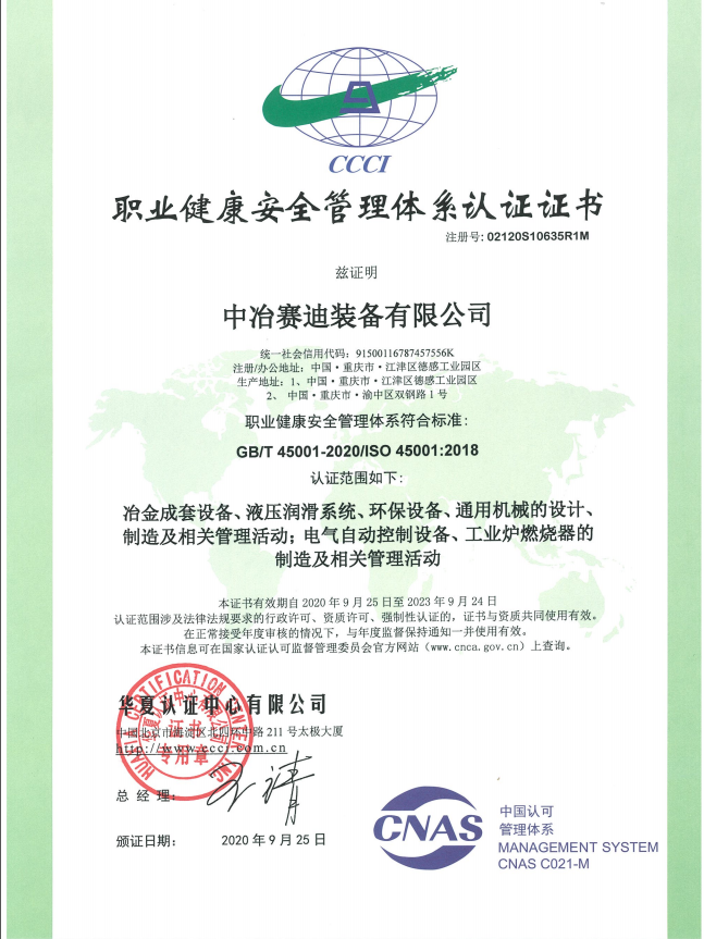 CNAS職業健康安全管理體系認證證書