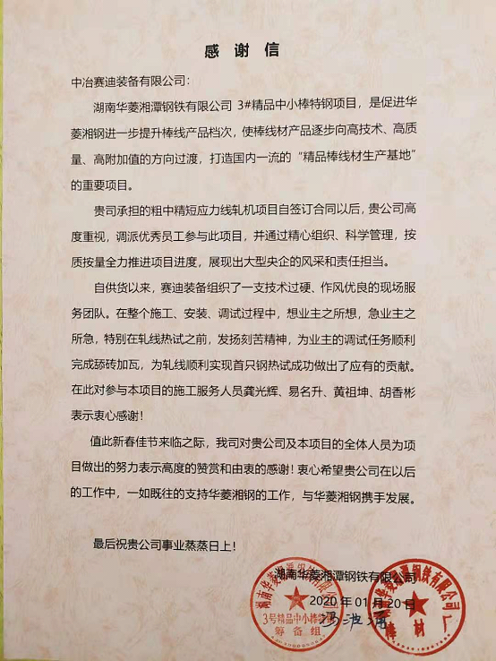 此項目從簽訂合同以來,賽迪裝備積極應對,精心組織,全力配合業主現場生產計劃,截止到2019年12月26日,該項目在線和備件共42臺套軋機全部運抵現場,陸續安裝、調試并一次性熱試成功,最終受到業主的好評,并專程發來了感謝信。