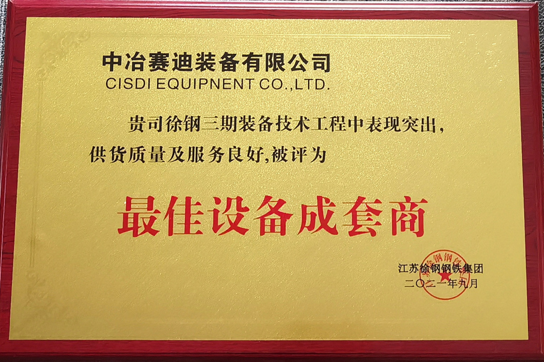 2021年9月,賽迪裝備在徐鋼三期裝備技改工程中表現突出,供貨質量及服務良好,被江蘇徐鋼鋼鐵集團評為“最佳設備成套商”。