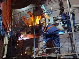 由賽迪股份總包、賽迪裝備承制的寶鋼集團新疆八一鋼鐵有限公司“150噸轉爐懸掛改型工程”項目,需要在項目現場進行焊接,承接現場焊接的協力公司能力有限,轉爐安裝焊接工作進度滯后了半個月。為保工期,在集團與公司各級領導的指導與協調下,公司制造中心分別于12月16日、17日、20日,分三批緊急抽調了14名(含外包隊伍)車間工作經驗豐富的焊接師傅,由結構車間主任張勇帶隊趕赴現場支援。到現場后還沒來得及休整即召開緊急會議,并查看現場實地情況,發現整個爐體上段工作還未開展;下段4個爐殼吊掛座還未焊接,4個托圈吊掛座焊了2個、還有2個未開始,同時已焊接的2個托圈吊掛座全部探傷不合格、需要刨開返修,工作量較大,加上全國大范圍寒潮來襲,新疆氣溫更是低至零下15度,低溫環境中需要進行焊條焊絲保溫、焊縫預熱等很多準備工作。會后大家就立刻投入到24小時的輪番作業中。