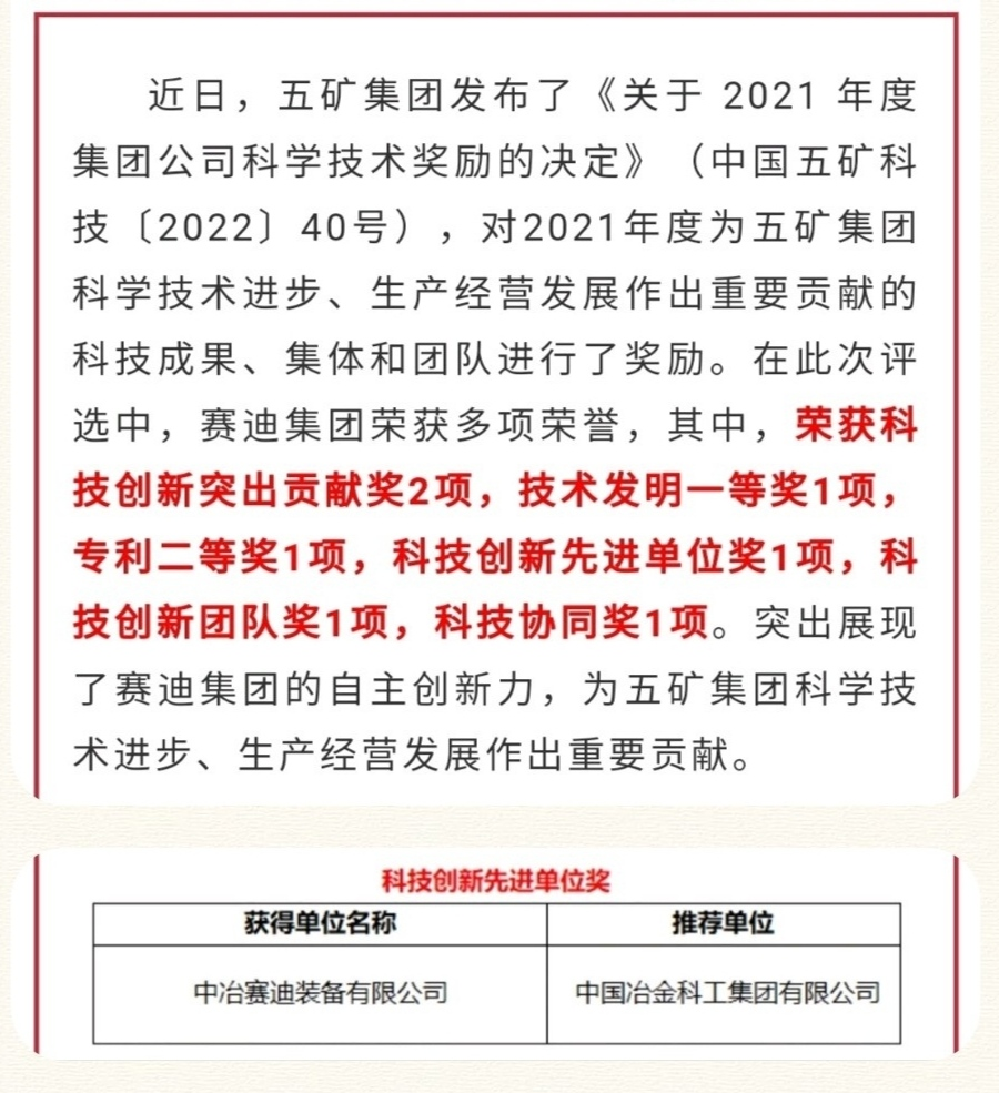 近日,五礦集團(tuán)印發(fā)了《關(guān)于 2021 年度集團(tuán)公司科學(xué)技術(shù)獎(jiǎng)勵(lì)的決定》(中國(guó)五礦科技〔2022〕40號(hào))文件,賽迪裝備榜上有名,榮獲2021年度五礦集團(tuán)科技創(chuàng)新先進(jìn)單位。