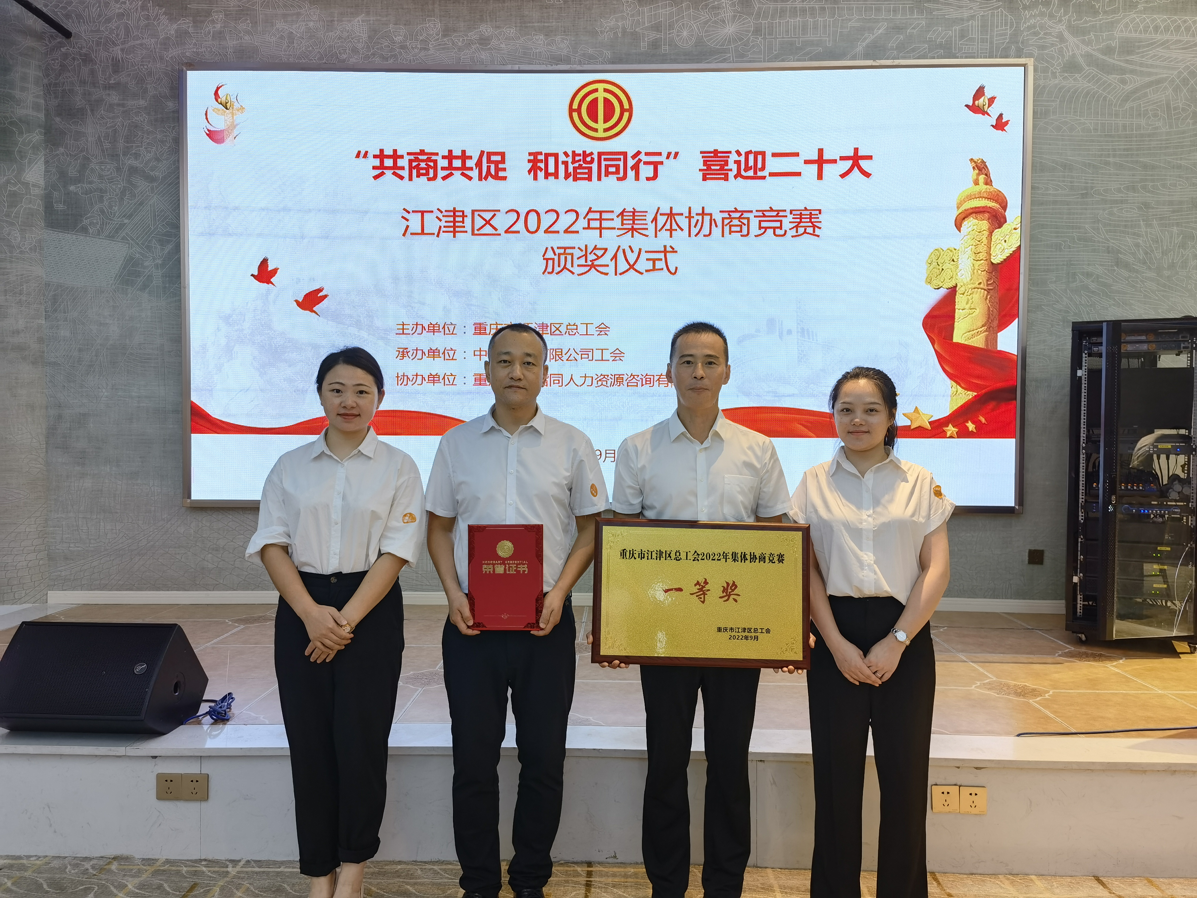 2022年9月15日,公司組隊參加了江津區總工會主辦的“共商共促 和諧同行 喜迎二十大”2022年集體協商競賽。這是公司首次組隊參與此類競賽,經初賽、復賽、決賽三輪激烈比拼,公司代表隊從12組企業代表隊中脫穎而出,最終斬獲一等獎,首席代表張昆獲“最佳協商員”個人獎項。