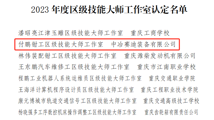 11月28日,中共重慶市江津區(qū)委組織部、江津區(qū)人力資源和社會(huì)保障局聯(lián)合下發(fā)《關(guān)于建立2023年度區(qū)級(jí)高技能人才培訓(xùn)基地和區(qū)級(jí)技能大師工作室的通知》,以公司骨干員工付鵬命名的“付鵬鉗工區(qū)級(jí)技能大師工作室”成功獲評(píng),同時(shí)賽迪裝備成功獲評(píng)江津區(qū)首批區(qū)級(jí)高技能人才培訓(xùn)基地。值得一提的是,裝備公司是本次評(píng)選中同時(shí)獲批2個(gè)項(xiàng)目的企業(yè)。
